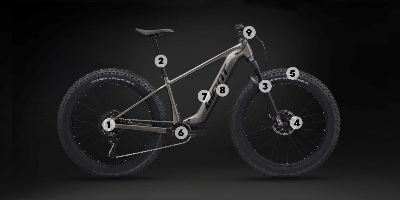 1. SRAM Universal Derailleur Hanger (takavaihtajan korvake) 2. Säädettävä Contact Switch AT -hissitolppa 3. Manitou Mastodon Comp - Gen 3, 27,5”, 100 mm:n haarukka 4. DOT-jarrut 5. 27,5" pyörät 6. SyncDrive Pro 2 -moottori 7. Tila kahdelle vesipullokiinnikkeelle sekä työkalukiinnikkeelle 8. 800Wh:n EnergyPak-akku 9. Kylmän sään jarruvipujen pehmusteet