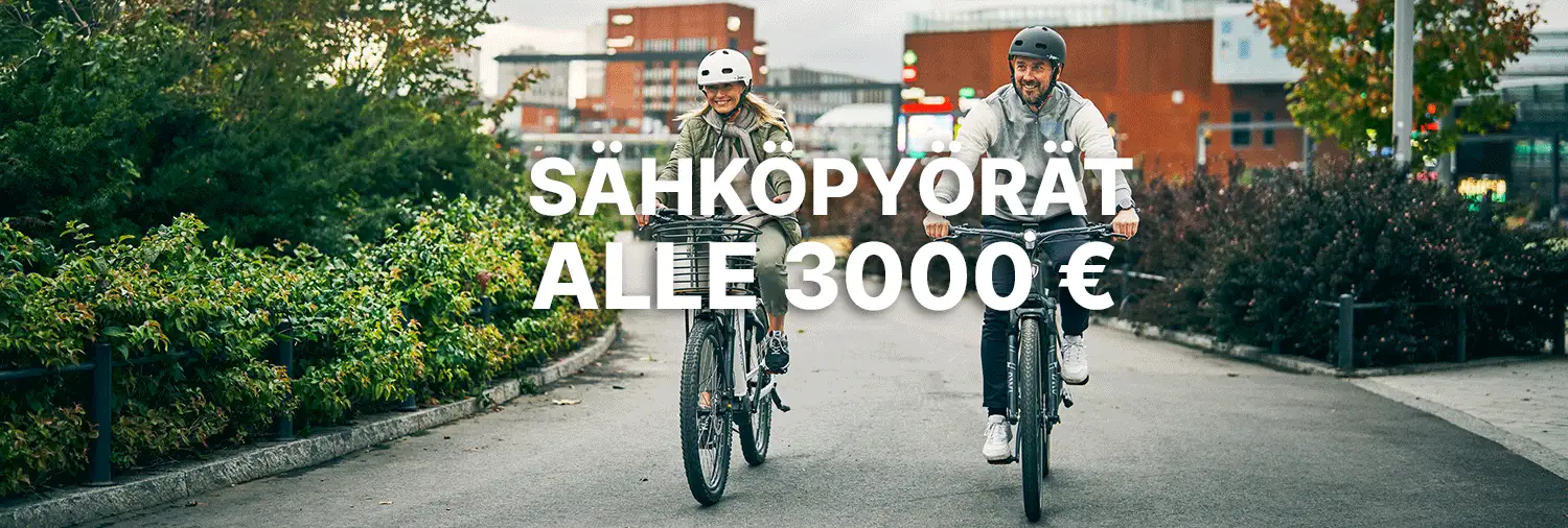 Löydä paras sähköpyörä alle 3000 euron hintaan! Meillä ei tarvitse tinkiä laadusta piiruakaan, sillä pidämme valikoimassamme vain laadukkaiksi todettuja huipputuotteita. Nämä suositut ja huippuominaisuuksilla varustetut sähköpyörät saat todella edulliseen alle 3000 euron hintaan. Jos et tältä sivulta löydä mieleistäsi pyörää, ota meihin yhteyttä, niin asiantuntijamme auttaa sinua löytämään sopivan pyörän juuri sinun tarpeisiisi. Jos etsit työsuhdepyörää, meiltä saat avaimet käteen -palveluna haluamasi pyörän. Autamme mielellämme sinu löytämään parhaan mahdollisen työsuhdepyörän. Katso kaikki sähköpyörätarjoukset. Katso myös sähköpyörät alle 4000 € ja sähköpyörät alle 5000 €.